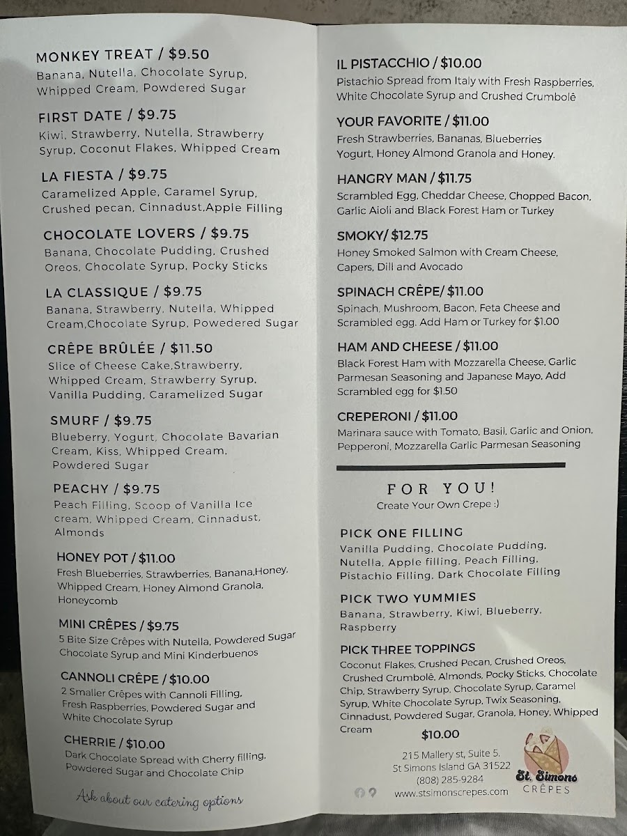 Welcome to St Simons Crepes, a delightful culinary haven located at 215 Mallery St, St Simons Island, GA. This charming spot specializes in fresh, made-to-order crepes that cater to every palate, whether you're craving something sweet or savory.